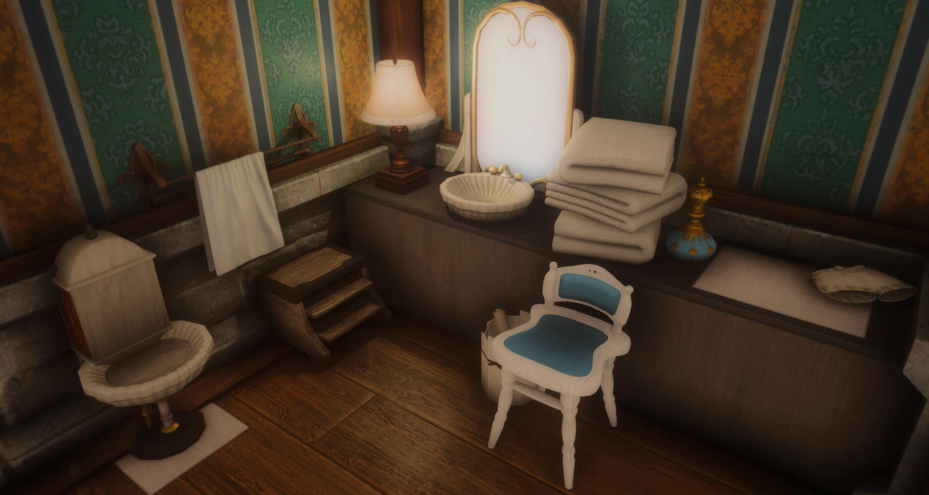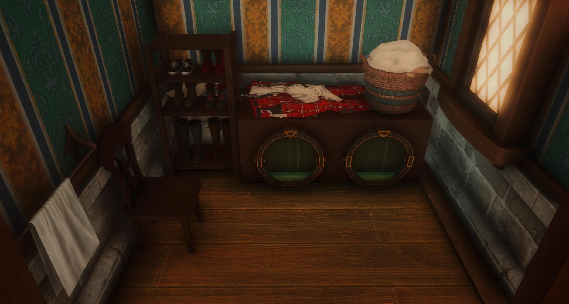 Get dry and dressed and into some clean clothes after showering.When the shower is unoccupied, feel free to make use of two magitek washing machines-- if you don't know how to use them, ask the owner. Use the laundry lines outside to dry, or if it is raining, hang them by the hearth.